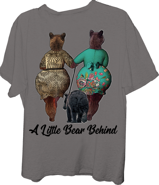 “A Little Bear Behind” is an awesome, funny, unique front/back bear design of a little bear cub (Front) and two lady bears walking the little bear (Back). Fun t-shirt gift for all ages, for you, a friend, or a family member.
