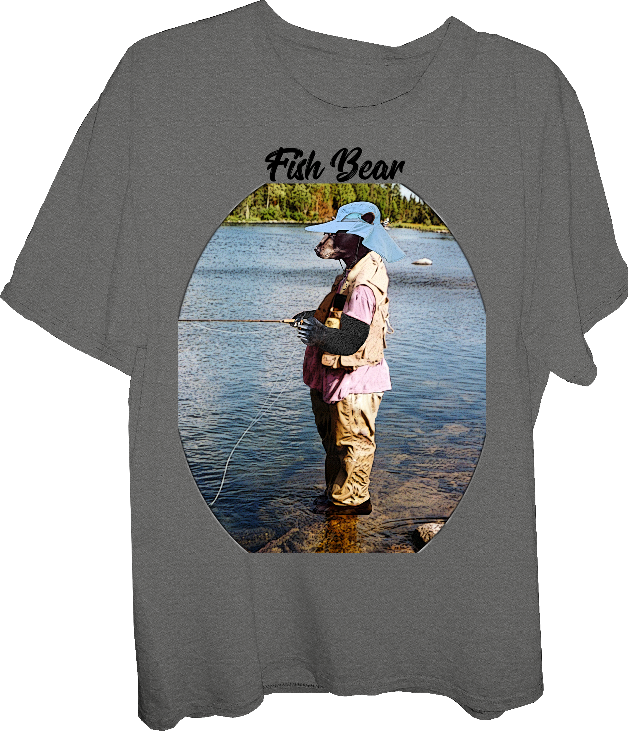 “Fish Bear” was inspired by Dr. Behr’s father Richard, from whom he learned to fish, and his brother David, who became a world class fly fisherman. A unique fun bear t-shirt of a bear fly fishing in a river. Above the image is the text “Fish Bear.” This design is also available without text at “Bear Fly Fishing T Shirt.” An awesome novelty gift for fishermen, fisherwomen and fishing children.